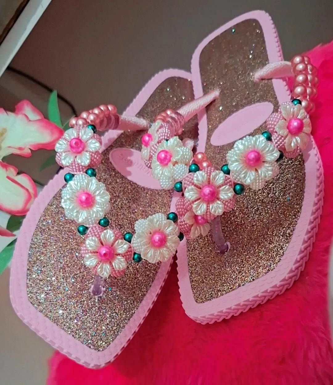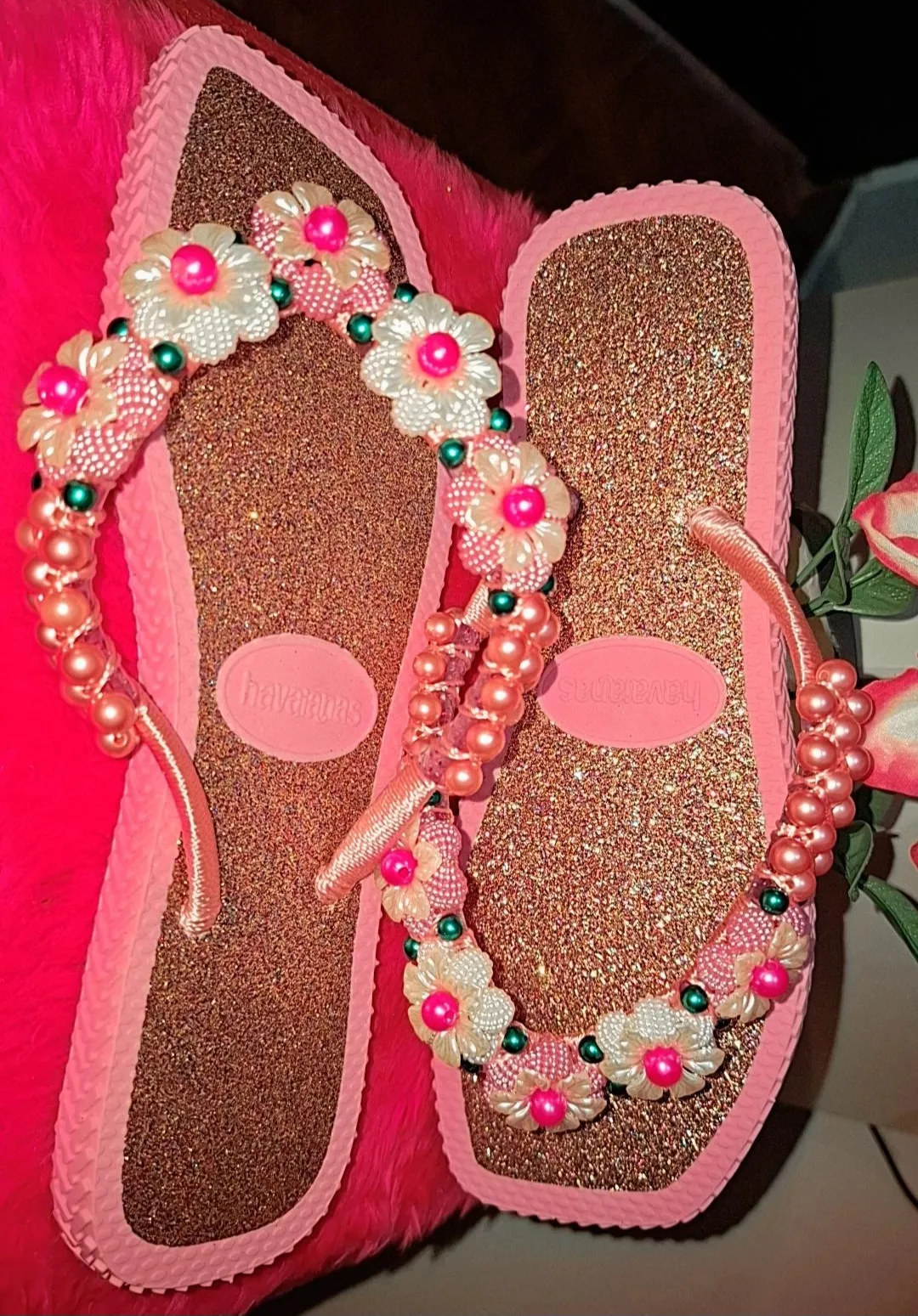 Com um deslumbrante tom de rosa com glitter e um delicado bordado de flores, este chinelo eleva qualquer look, tornando-se ideal para passeios na praia ou um dia descontraído na cidade.