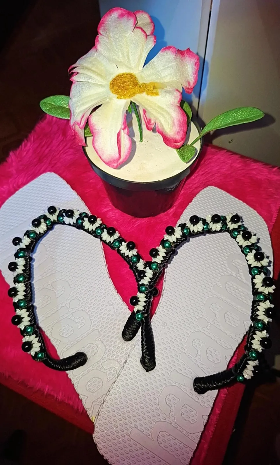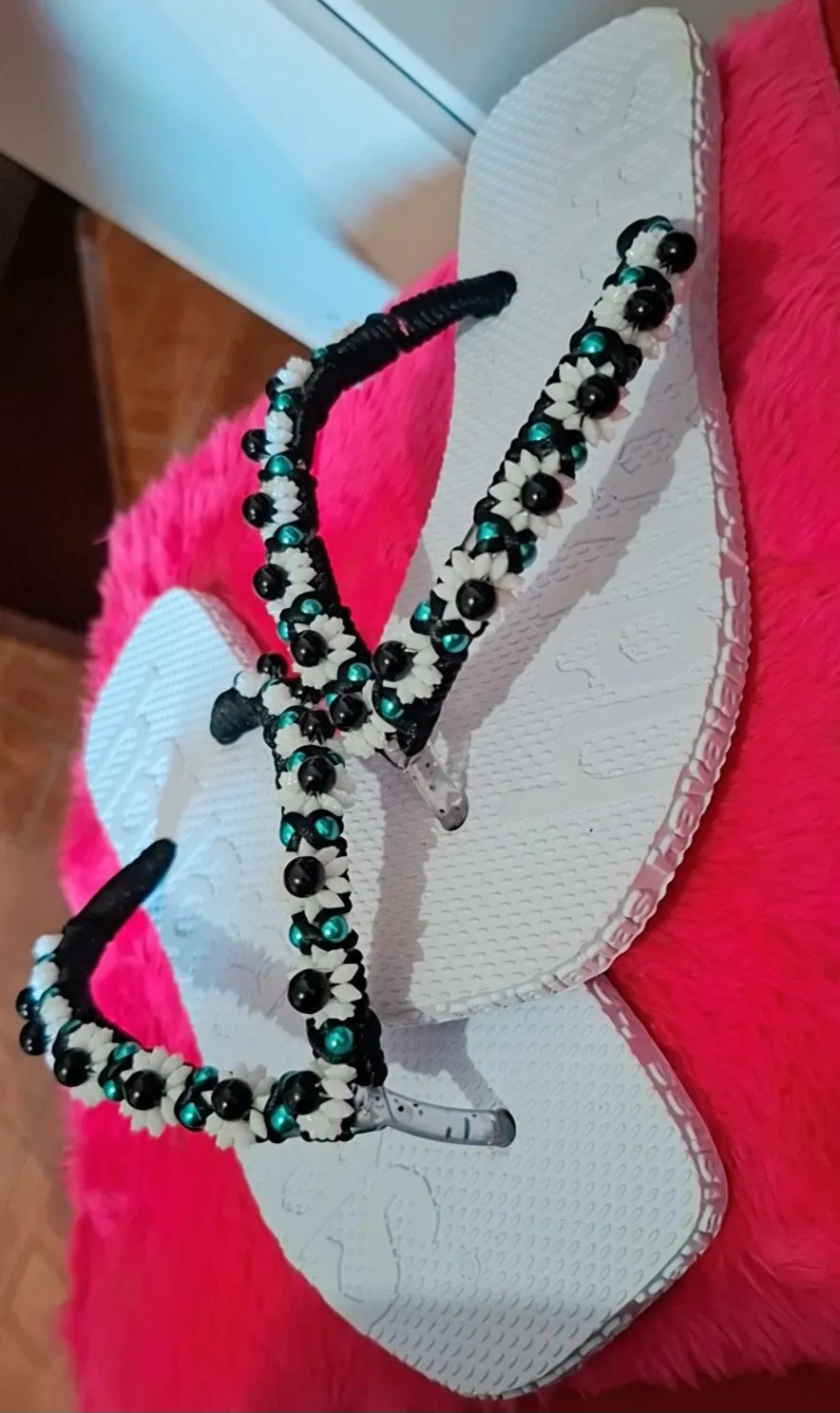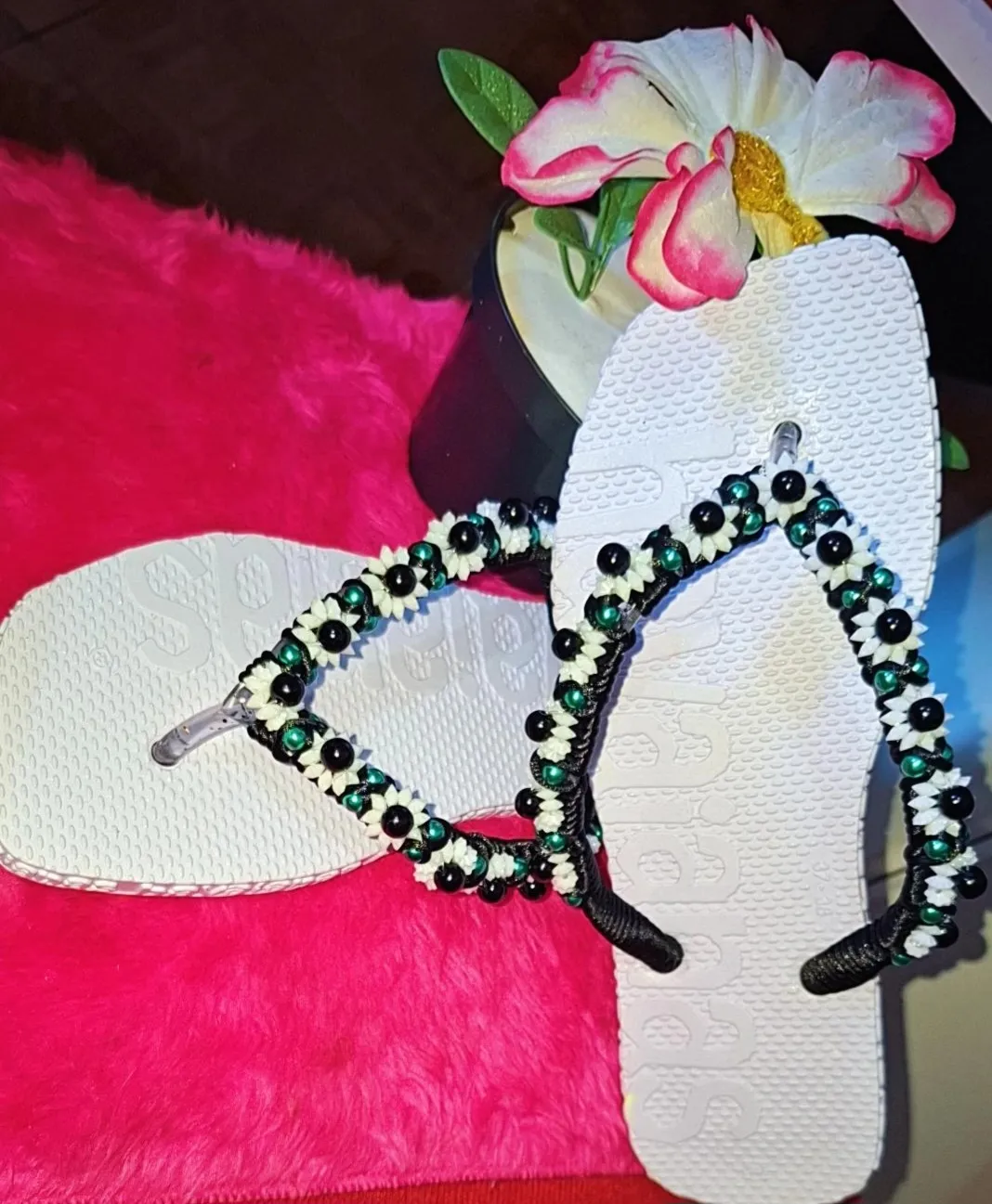 Descubra o Chinelo Branco com Flores Brancas e Pretas, a combinação perfeita de estilo e conforto.